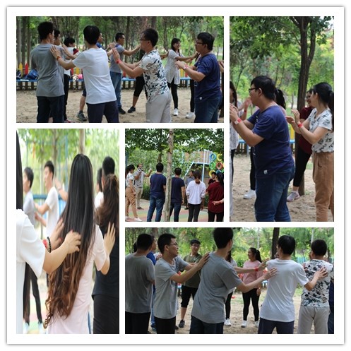 全体参加培训的人员分别组成两队,并进行各队的文化展示,两队分别是“战狼队”和“飓风队”,“战狼队”的队训是“ 战狼无敌”,“飓风队”的队训是“飓风必胜”,大家斗志昂扬,积极参与,文化展示的热情一浪高过一浪。激情节拍-所有小组成员间隔适当的距离围成一个圈,大家双手轻拍左边同伴的肩并拍手,用鼓掌的方式依次按字大声喊出"我们是最棒的团队".用多次计时来挑战自己的团队,看做完专业拓展项目的最短时间,培养学员的责任心。此外进行了“横行霸道”、“背对信摔”、“同心球”等拓展项目。