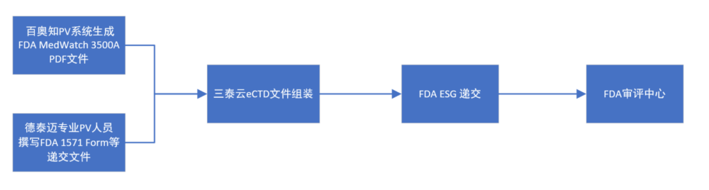 目前,FDA的IND Safety Report 是使用MedWatch 3500A PDF文件通过eCTD形式递交,百奥知的PV服务战略合作伙伴:德泰迈(杭州)医药科技有限公司,始终致力于为客户提供高标准的全球化药物警戒服务,目前为客户负责多项中美临床试验项目中的药物警戒工作,德泰迈使用百奥知PV系统生成MedWatch PDF报告表,通过北京三泰云技术有限公司eCTD系统进行注册文件组装,使用ESG能顺利递交至FDA。